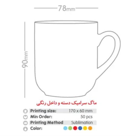 • نام کالا لیوان دسته و داخل رنگی کد کالا XMS-6006 قیمت 1,400,000 ریال حداقل تیراژ 300 رنگ بندی ابعاد کالا 90x78 mm ابعاد محل چاپ 45*45 mm نوع چاپ سابلی میشن هزينه چاپ برای هر عدد مبلغ 150000 ريال و برای حداقل تيراژ 300 عدد در نظر گرفته می‌شود.