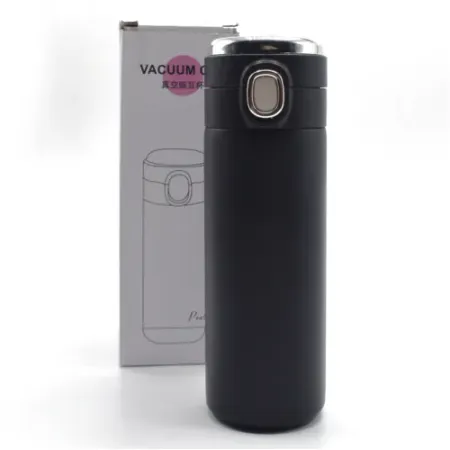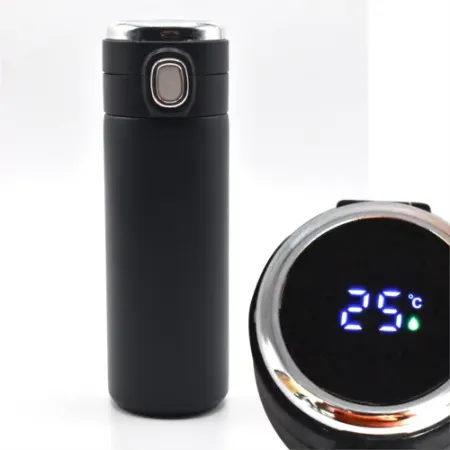 • فلاسک استیل دولایه با قابلیت نمایش میزان دمای داخل فلاسک حجم 420 میلی لیتر دارای حلقه استیل در بالای درب این محصول با یک کلید فشاری و بصورت لولایی از قسمت بالای فلاسک باز میشود و همچنین دارای قفل روی کلید جهت جلوگیری از بازشدن ناخواسته درب است. رنگ بدنه مشکی مات بسیار زیبا و جذاب دارای صفحه حساس به لمس دست که با تماس دست صفحه دیجیتال نمایشگر دمای داخلی فلاسک روشن میشود. دارای جعبه چاپی مقوایی درب درب لولایی باز شونده از قسمت بالا و لبه لاستیکی برآمده جهت سهولت نوشیدن مایعات بطور مستقیم میباشد. امکان حک لیزر جنس بدنه از استیل مرغوب با ساخت دولایه که میتواند دمای مایع درونی را برای ساعتها حفظ نماید این محصول بصورت تکرنگ مشکی موجود است.