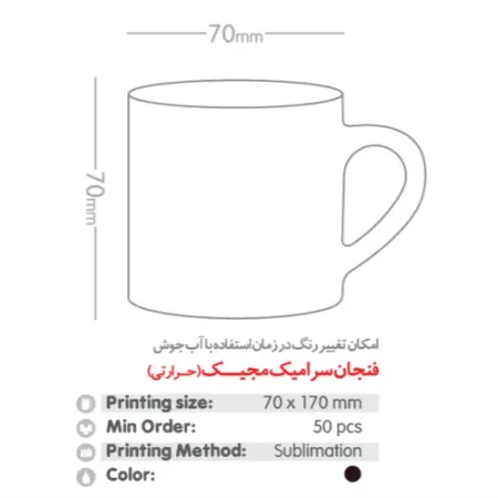 • نام کالا فنجان حرارتی جادویی کد کالا XMS-250 قیمت 1,400,000 ریال حداقل تیراژ 300 رنگ بندی ابعاد کالا 7x7 cm ابعاد محل چاپ 17x7 cm نوع چاپ سابلی میشن هزينه چاپ برای هر عدد مبلغ 150000 ريال و برای حداقل تيراژ 300 عدد در نظر گرفته می‌شود.