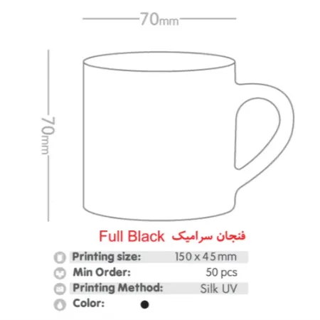 • فنجان سرامیکی مشکی دارای جعبه مقوایی چاپ روی این لیوان بصورت تامپو یا چاپ کوره ای انجام میگردد هزینه برای هر ضرب می باشد یک چاپ تکرنگ یکطرف مثلا طرح دو رنگ میشود 2 ضرب برای یک طرف و برای دو طرف لیوان 4 ضرب محاسبه میگردد.