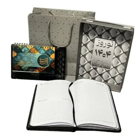 ابعاد صفحات : 11 * 16 | ابعاد یادداشت : 11 * 7 13 برگ همراه با نخست 250 گرم همراه با روکش سلفون مات و یووی موضعی |برجسته 30 برگ یادداشت تحریر خارجی همراه با چاپ تک رنگ مشکی صفحات گلاسه 200 گرم خارجی همراه با 4 رنگ پشت و رو|
