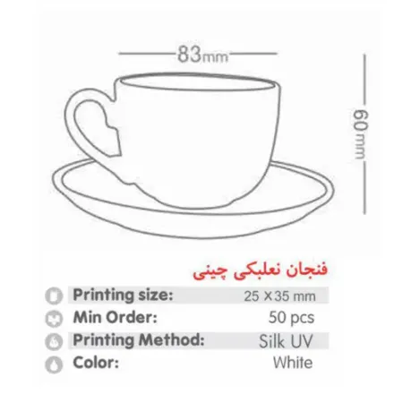 • فنجان نعلبکی مربع چینی دارای جعبه مقوایی ابعاد چاپ کوچک و محدود 3.5x2.5 سانتیمتر چاپ روی این هدیه بصورت تامپو یا چاپ کوره ای انجام میگردد هزینه برای هر ضرب می باشد یک چاپ تکرنگ یکطرف مثلا طرح دو رنگ میشود 2 ضرب برای یک طرف و برای دو طرف لیوان 4 ضرب محاسبه میگردد.