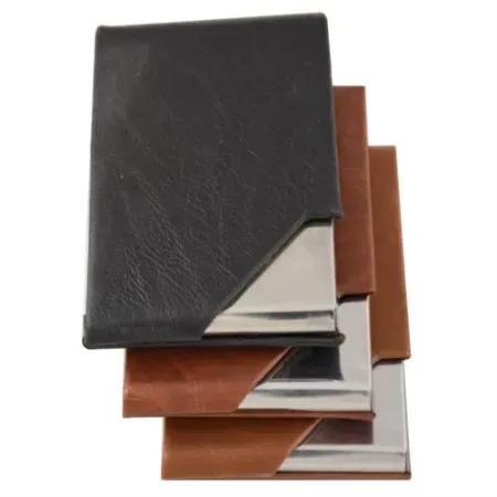 • توجه : در تمامی نمونه های جاکارتی برای رنگ طلایی 15 الی 20 درصد افزایش قیمت وجود دارد. جاکارتی تبلیغاتی چرم و استیل طرح عمودی گوشه دار بدنه این جاکارتی از جنس فلزی با روکش چرم و سطح داخل از پارچه جیر مشکی پوشیده شده و درب با استفاده از مگنت بسته و قفل میگردد. جارکارتی شیک و با کیفیت و طراحی زیبا میباشد. جاکارتی تبلیغاتی جزو هدایای تبلیغاتی ماندگار و ارزان با قیمت مناسب محسوب میگردد که امکان حک لیزر روی بدنه چرم و یا قسمت فلزی را دارد و تبلیغ بطور همیشگی به همراه مخاطب دیده و حفظ میگردد. رنگبندی قهوه ای تیره ، قهوه ای روشن ، عسلی و مشکی رنگبندی بدنه فلزی : نقره ای ، دودی و طلایی که قیمت در حالت طلایی افزایش دارد. دارای جعبه مقوایی زیبا و شکیل مشکی رنگ