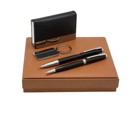 • ست کادویی RELAX جزئیات ست کادویی RELAX : – ست روان نویس ، خودکار ، جاکلیدی و کیف کارت ویزیت – ابعاد ست : ۱۸۶ میلی متر طول ، ۱۶۸ میلی متر عرض ، ۳۸ میلی متر ارتفاع – اجزای کیف کارت ویزیت ، جاکلیدی و قلم با کروم آبکاری شده است. – بر روی کیف کارت ویزیت و جاکلیدی مقداری فضا تهیه شده است برای درج نام شرکت و لوگو که با دستگاه لیزر حکاکی بر روی آن حک می شود. – با حک کردن نام و لوگوی شرکت خود بر روی این ست کادویی نام شما همیشه در ذهن مخاطب باقی خواهد ماند. ارسال به سرار ایران شهرگیفت ارائه دهنده انواع هدایای تبلیغاتی آماده ی خدمت رسانی به شما عزیزان است. شما می توانید از انواع محصولات ما دیدن کنید و جهت سفارش از دریافت مشاوره رایگان بهره ببرید.