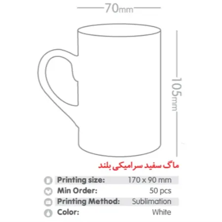 • لیوان سرامیکی دسته و داخل سفید دارای جعبه مقوایی ابعاد چاپ کوچک و محدود 4 سانتیمتر چاپ روی این لیوان بصورت چاپ کوره ای انجام میگردد هزینه برای هر ضرب می باشد یک چاپ تکرنگ یکطرف مثلا طرح دو رنگ میشود 2 ضرب برای یک طرف و برای دو طرف لیوان 4 ضرب محاسبه میگردد.