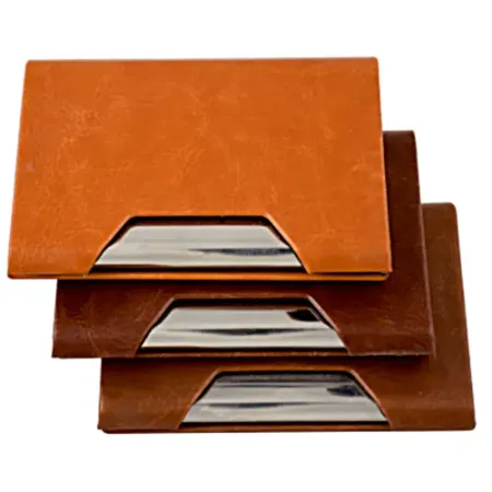 • توجه : در تمامی نمونه های جاکارتی برای رنگ طلایی 15 الی 20 درصد افزایش قیمت وجود دارد. جاکارتی تبلیغاتی چرم و استیل بدنه این جاکارتی از جنس فلزی با روکش چرم بوده و یکی از پرفروشترین مدلهای جاکارتی به شمار می آید سطح داخل از پارچه جیر مشکی پوشیده شده و درب با استفاده از مگنت بسته و قفل میگردد. جارکارتی شیک و با کیفیت و طراحی زیبا میباشد. جاکارتی تبلیغاتی جزو هدایای تبلیغاتی ماندگار و ارزان با قیمت مناسب محسوب میگردد که امکان حک لیزر روی بدنه چرم و یا قسمت فلزی را دارد و تبلیغ بطور همیشگی به همراه مخاطب دیده و حفظ میگردد. رنگبندی قهوه ای تیره ، قهوه ای روشن ، عسلی و مشکی رنگبندی بدنه فلزی : نقره ای ، دودی و طلایی که قیمت در حالت طلایی افزایش دارد. دارای جعبه مقوایی زیبا و شکیل مشکی رنگ