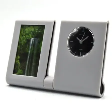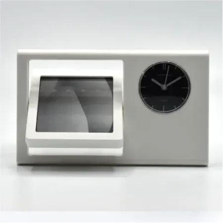 • ساعت رومیزی به همراه قاب عکس هدیه تبلیغاتی زیبا و ماندگار با فضای چاپ و حک مناسب و کاربردی نیروی محرکه ساعت توسط یک باتری ساعتی کوچک تامین میگردد دارای جعبه مقوایی چاپی شکیل
