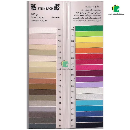 • توضیحات مقوا اشتنباخ رنگی 160 گرم سایز 70×50 سانتی متر دو رو بافت چکشی بسیار لطیف قابلیت چاپ با پرینترهای لیزری و جوهر افشان کاربرد: نقاشی پاستل و زغال، گلسازی، کاردستی، چاپ بروشور، انواع کارت تبریک و کارت دعوت، کاتالوگ و کلیه کارهای هنری